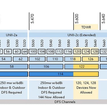 Now with 5GHz and 6GHz you get into various channels and bandwidths and this is because of something I mentioned earlier, channel bonding. Now because these higher frequencies have less range than 2.4 the risk of interference is lower so taking more of the spectrum has less affect on the surrounding networks or other signals propagating at these frequencies. These higher frequencies use what is called DFS (Dynamic Frequency Selection) and LPI (Low Power Indoor) The purpose behind DFS is to ensure that weather or military radars are not interfered with. Over half of the 5GHz sprectrum is comprised of DFS channels in the United States. LPI is specific for 6GHz and Wi-Fi 6e which allows users to allocate up to 160MHz and with Wi-Fi 7 that number increases to 320 MHz for even faster data transmission.